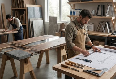 Bespoke furniture in exotic wood, stone, and clear epoxy.